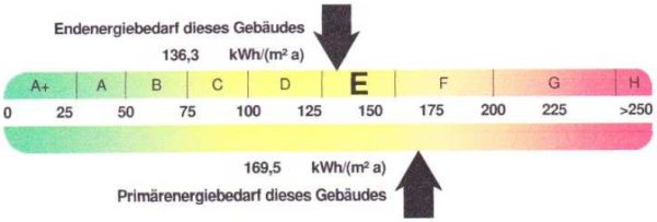 Für das Objekt liegt ein Energieausweis nach EnEV 2014 vor. Dieser basiert auf dem errechneten Energiebedarf und weist einen Endenergiebedarf von 134,00 kWh/(m²*a) aus. Dies entspricht der Energieeffizienzklasse E. Der wesentliche Energieträger ist Erdgas. Das Baujahr des Objektes ist 1994.