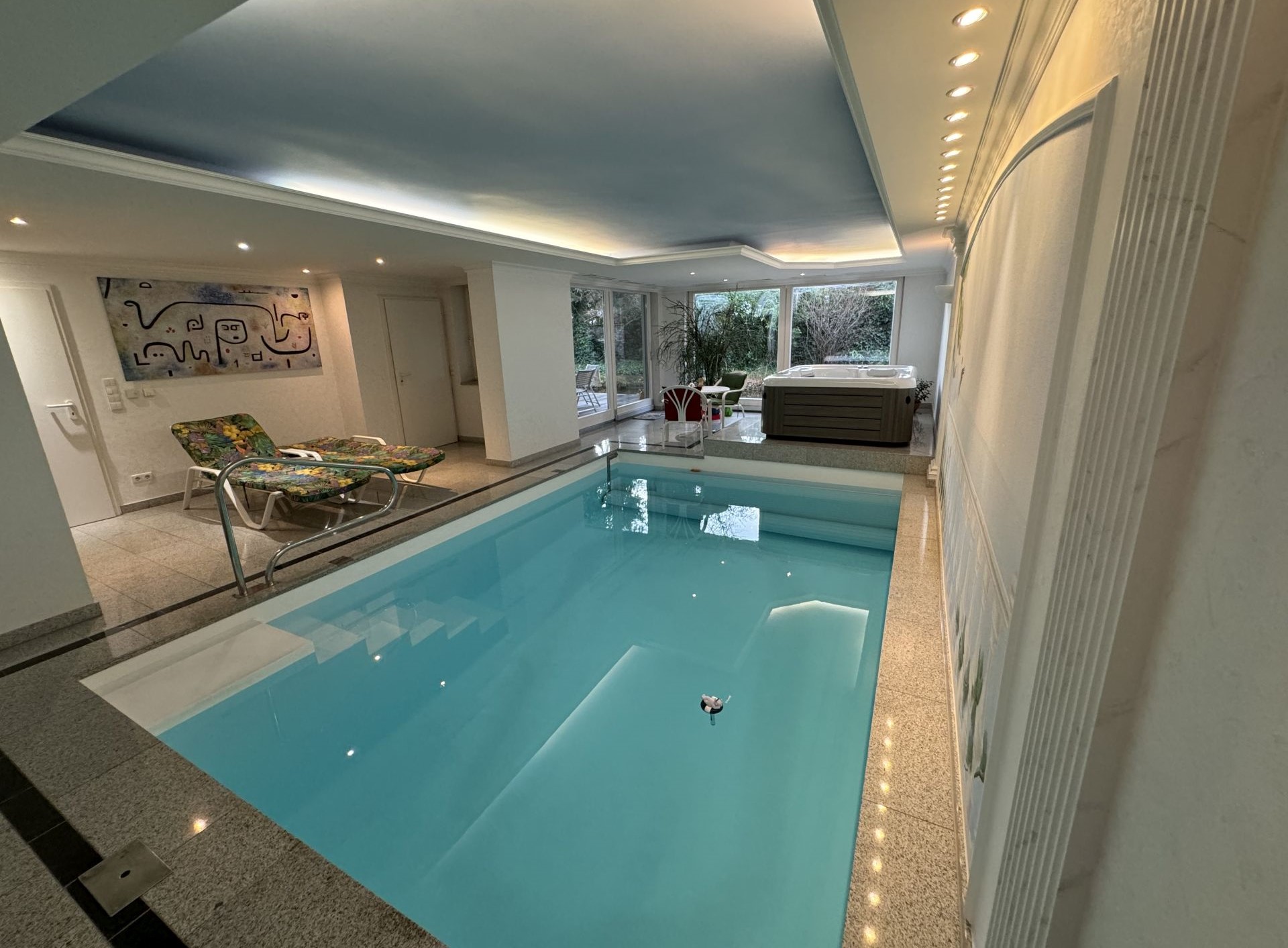 Indoor-Schwimmbad und Whirlpool mit angrenzender Sauna: Das beheizte Schwimmbad mit Sauna bildet den perfekten Rückzugsort für Wellness und Entspannung in den eigenen vier Wänden. Das ganze wird abgerundet mit dem zum Schwimmbad angrenzenden Whirlpool und dem direkten Terrassenzugang vom Schwimmbad aus.