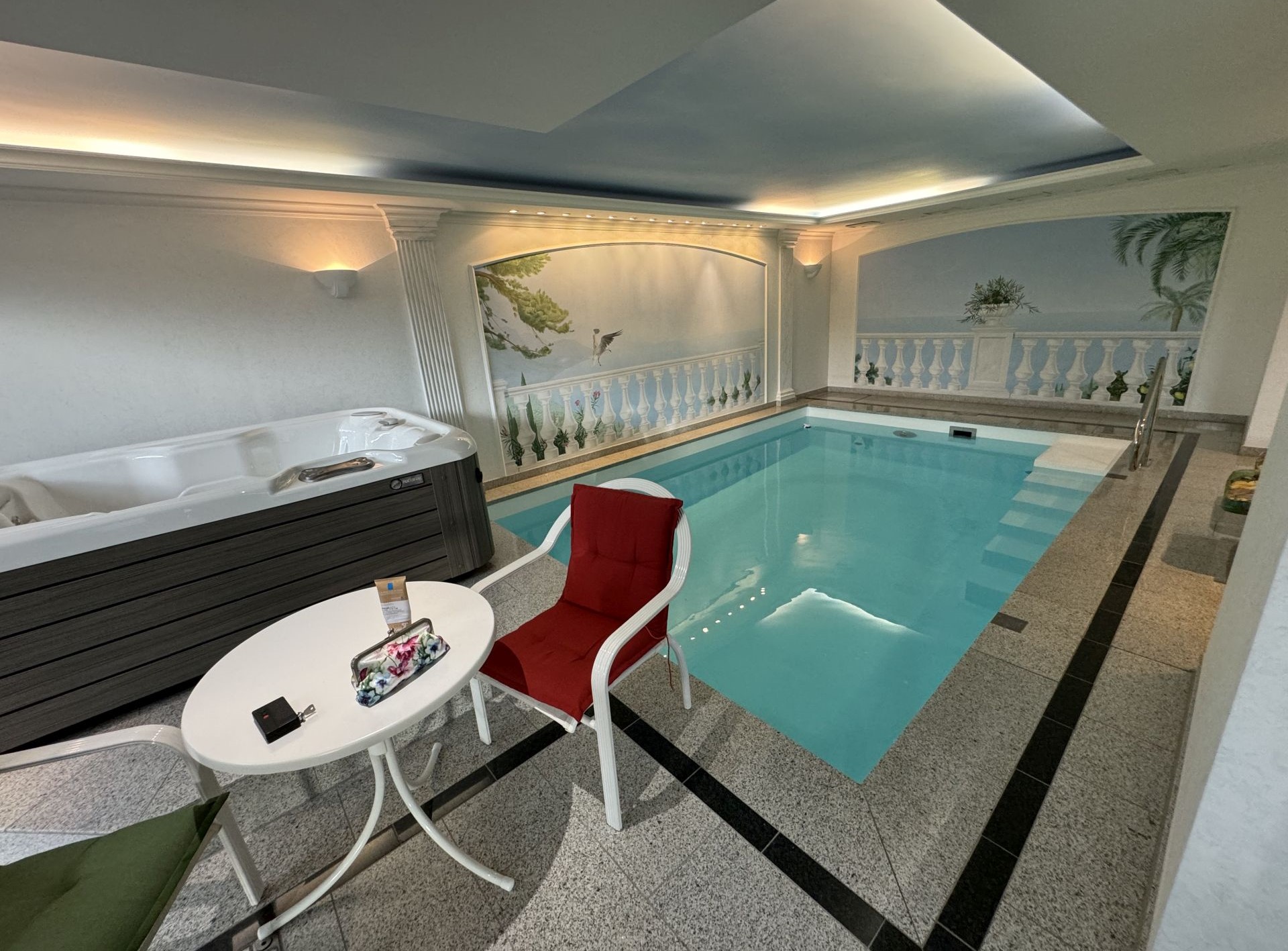 Indoor-Schwimmbad und Sauna: Das Indoor-Schwimmbad mit einer Größe von 5,55 m x 3,60 m x 1,80 m ist laufend instandgehalten und weiter optimiert worden.