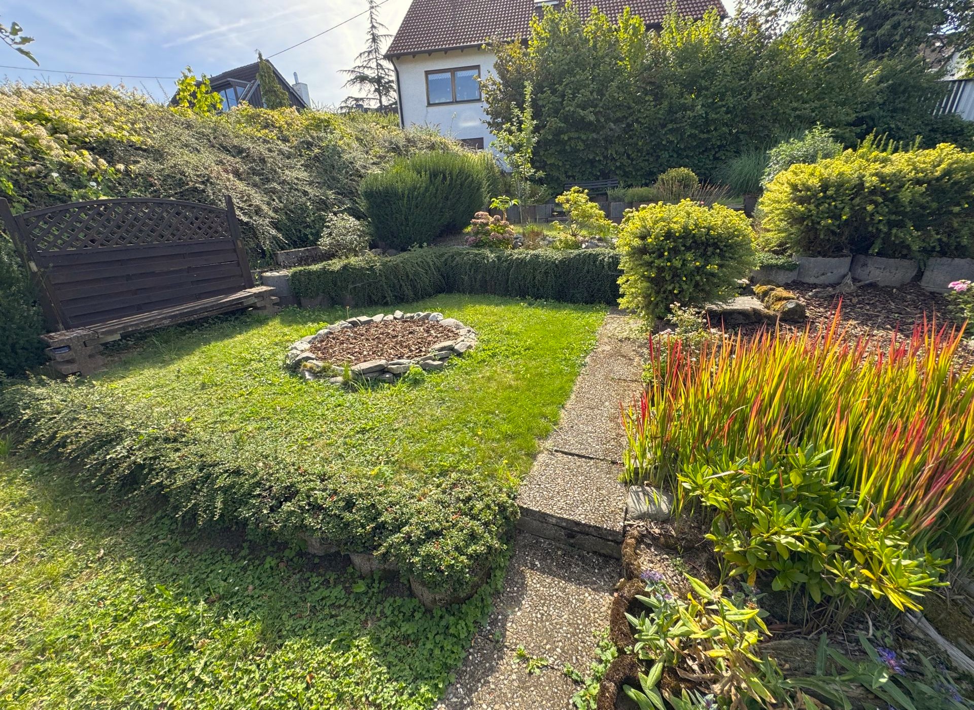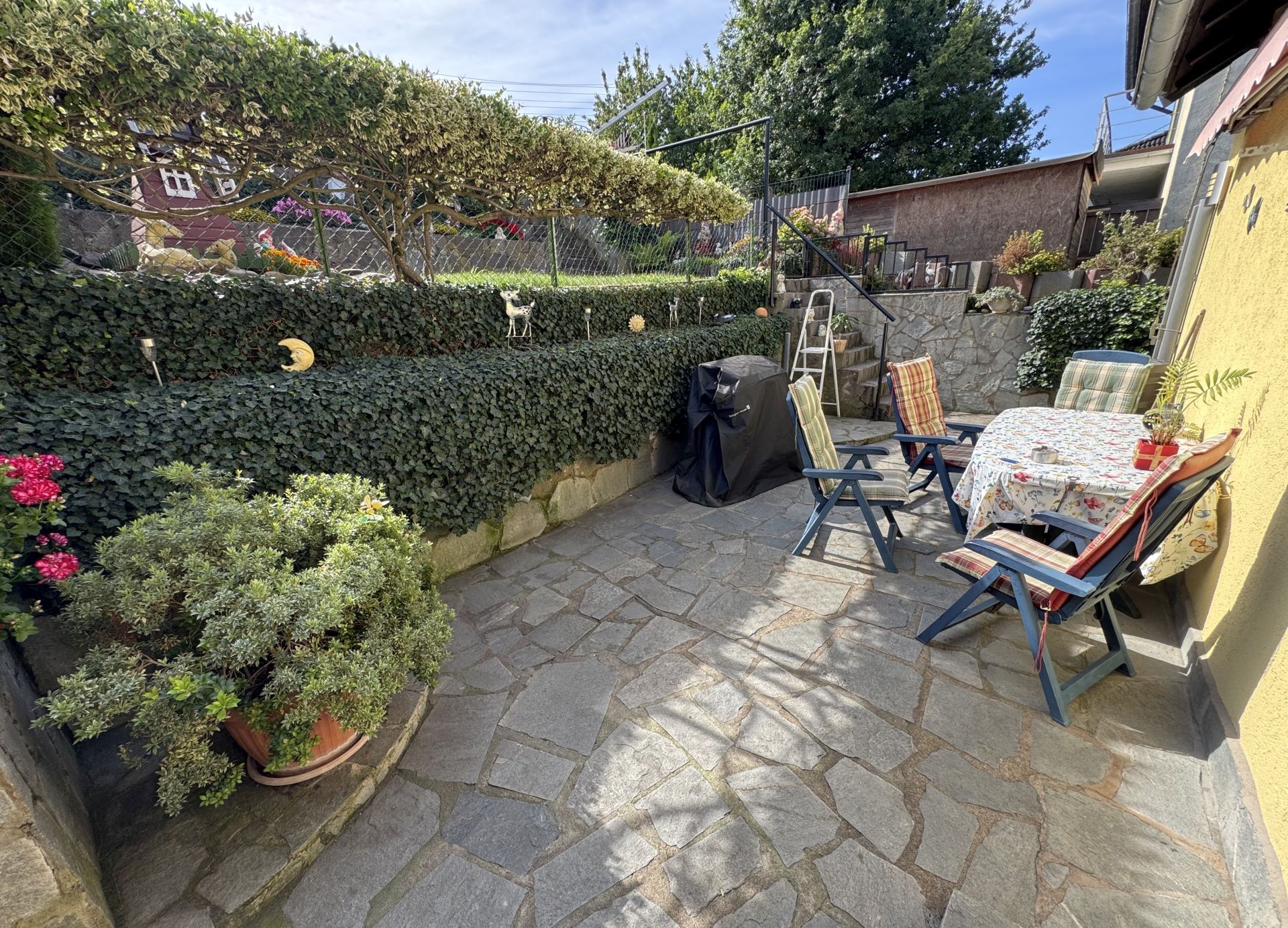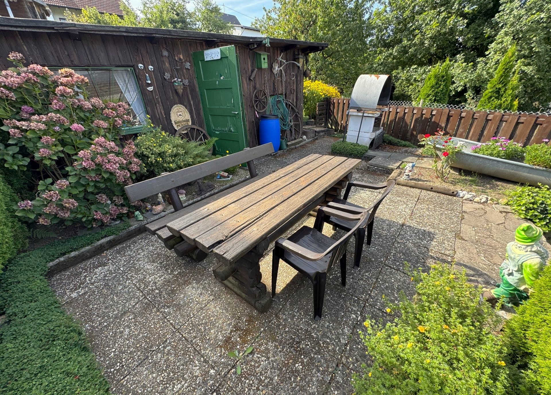 Der Garten des Hauses erstreckt sich über mehrere Ebenen und überrascht mit liebevoll gestalteten Details: Ein großzügiges Gartenhaus mit angrenzendem Grillplatz, ein praktischer Wäschetrocknungsbereich sowie zahlreiche sorgfältig angelegte Beete runden dieses Angebot ab.