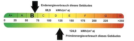 Für das Objekt liegt ein Energieausweis nach EnEV 2014 vor. Dieser basiert auf dem tatsächlichen Energieverbrauch und weist einen Energieverbrauchskennwert von 68,90 kWh/(m²*a) aus. Der Energieverbrauch für Warmwasser ist hierin nicht enthalten. Dies entspricht der Energieeffizienzklasse B. Der wesentliche Energieträger ist Strom. Das Baujahr des Objektes ist 1978.